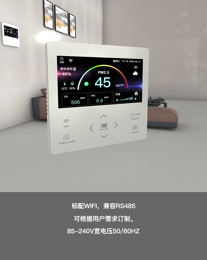 標(biāo)配PM2.5傳感器,可選配CO2/WIFI/485