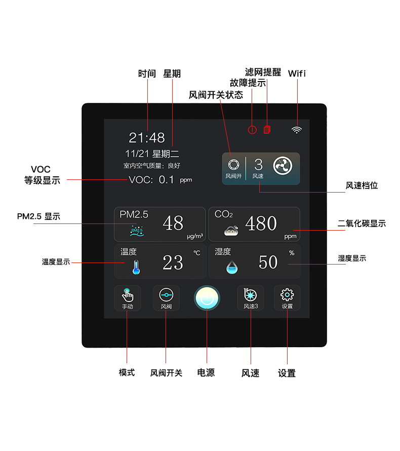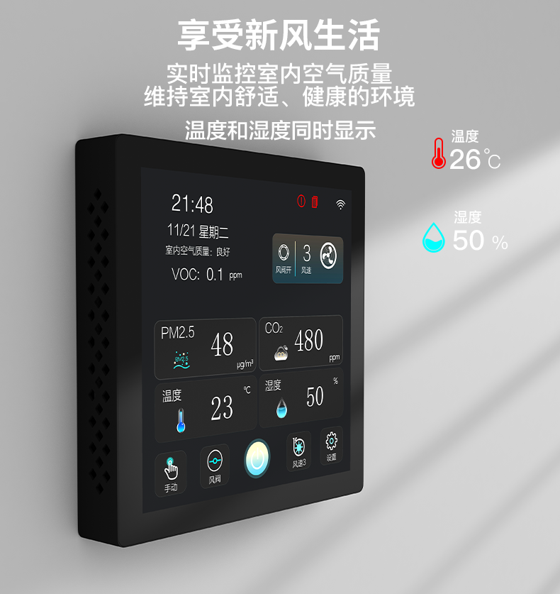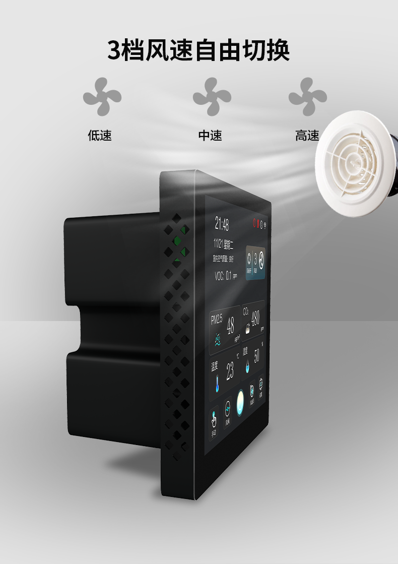 實(shí)時(shí)顯示PM2.5、CO2、TVOC